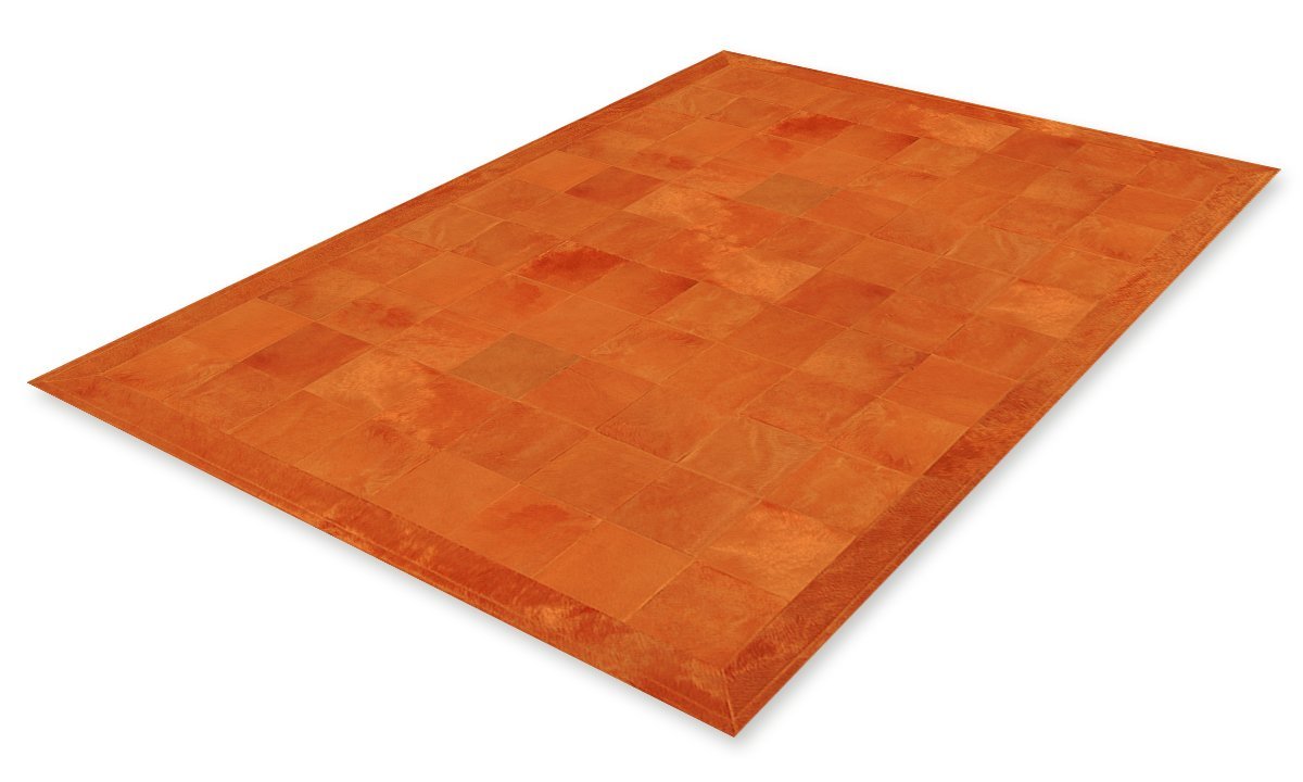 Hand made skin rug in Orange color, custom made at any size, from high quality cow leather panels of 20×20 cm, with special treatment for use on the floor.